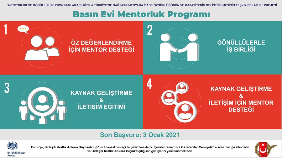 Gazeteciler Cemiyeti, Sivil Topluma Artı Derneği iş birliği ve Birleşik Krallık Büyükelçiliği finansal desteğiyle Basın Evi Mentorluk Programı ve Gönüllük Programı başlatıyor. Her iki programa başvuru için son tarih 3 Ocak 2021.