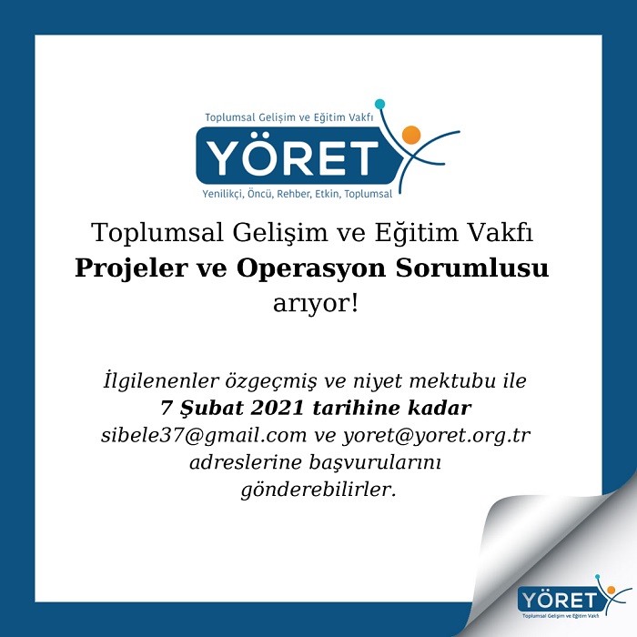YÖRET Vakfı, İstanbul'da görev alacak ''Projeler ve Operasyon Sorumlusu" arıyor. Son başvuru tarihi 7 Şubat 2021.