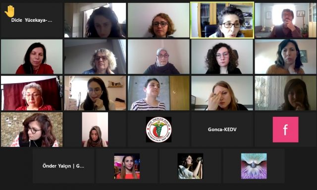 Toplantıda ilk söz alan Kadın Emeğini Değerlendirme Vakfı’ndan Gonca Şahin, İstanbul ve Gaziantep’te Türkiyeli ve Suriyeli kadınlarla beraber dayanışma ağlarını harekete geçiren Evden Eve Mahalle programından söz etti. Program kapsamında kadınların dijital araçlarla mahallerde sorunları tespit ettiklerini belirten Şahin, çıkan sonucun “katmerli bir yoksullaşma” olduğunu belirtti. Özellikle kayıtlı olmayan mültecilerin en temel insani haklara ulaşmasının bile imkansızlaştığını gözlemlediklerini belirten Şahin, Türkiye’de sosyal güvenlik ağlarının güçlü olduğu kabulüne karşın sahada dayanışma ve komşuluk ağlarının zayıf olduğunu, salgının bir izolasyon sürecine sebep olduğunu ifade etti.