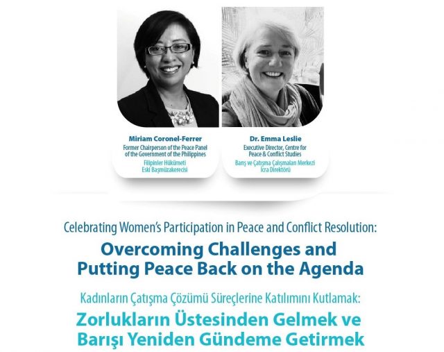Etkinliğin ilk konuşmacısı olan Filipinler Hükümeti Başmüzakerecesi Prof. Miriam Coronel-Ferrer, barış süreci sırasında karşılaştıkları zorlukları ve bunları nasıl çözümler getirildiğiyle ilgili bir sunum yaptı. Kadınların müzakerelerde yer almasının kendi başına yeterli olmadığını dile getiren Ferrer, “Nihai barış anlaşmasında da kadınların sorunlarını, toplumsal cinsiyet konularını ele alan hükümler bulunmalı.” dedi. Dünyanın her yerinde kadınların barış masalarında yer almalarını sağlamanın kolay olmadığını kadınların bunun için uzun mücadeleler yaptığını hatırlatan Ferrer, kadın liderliklerinin normalleştirilmesi, hükümet içinde kadınların temsil edilmesi gerektiğini söyledi. Ferrer, müzakerelerin anlaşmayla sonuçlanması ve barışın kalıcı olması için sivil toplum kuruluşlarının resmi mekanizmalar içinde yer almasının ve kadınların izleme görevi yapmasının önemine de vurgu yaptı.