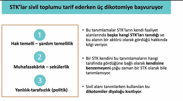 - STK’lar sivil toplumu hak temelli-yardım temelli; muhafazakarlık-sekülerlik; yanlılık-tarafsızlık(siyasi) şeklinde 3 dikotomiyi esas alarak tarif ediyor.