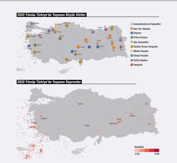 2020 yılında meydana gelen afetlerin ve depremlerin haritalarla ifade edildiği yıllıkta, bir diğer öne çıkan konu, tüm dünyayı etkisi altına alan COVID-19 salgını oldu. “Ulusal ve küresel ölçekte hayatımızın her alanını etkileyen COVID-19 pandemisi 2020 yılı boyunca insani yardım gündeminin en önde gelen konusu oldu. Bununla birlikte, dünyanın farklı bölgelerinde çok çeşitli afetler ve insani krizler de yaşandı.