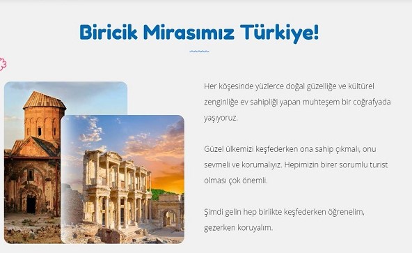 Mirasım Türkiye web sitesinde, her kurum ve bireyin “sürdürülebilir turizm” ve “sorumlu turist” anlayışı ile hareket etmesinin önemi vurgulanıyor ve Türkiye’nin zengin mirasını keşfederken aynı zamanda korunması gerektiğine dair çeşitli başlıklarda içerikler yer alıyor: Sorumlu Çocuk Turist Kimdir”? Neler yapmalı? Küresel Amaçlar ve Çocuklar, Mirasım Türkiye Atlası. Web sayfasında ayrıca Türkiye’nin sahip olduğu mirasa ilişkin detaylara da yer veriliyor.