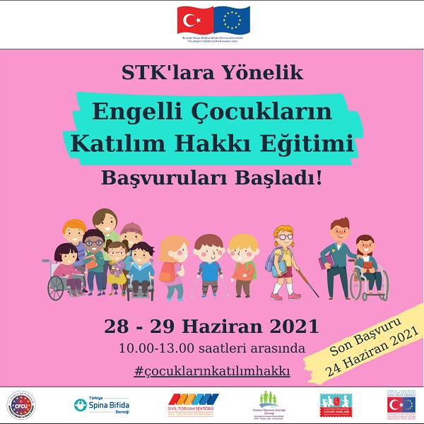 Türkiye Spina Bifida Derneği, 28-29 Haziran 2021 tarihlerinde sivil toplum kuruluşlarına yönelik "Engelli Çocukların Katılım Hakkı" eğitimi düzenliyor. Son başvuru tarihi 24 Haziran 2021.