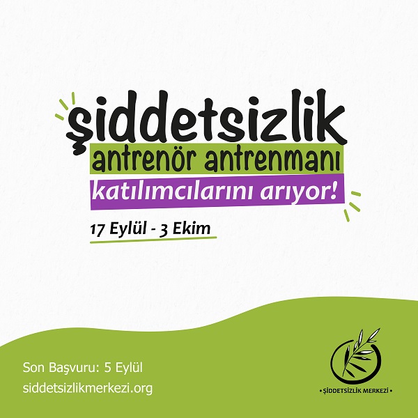 Şiddetsizlik Merkezi, şiddetsizlik kültürünü yaygınlaştırmayı ve hak mücadelesi veren örgütlerin şiddetsiz örgütlenmesini desteklemek amacıyla, Şiddetsizlik Antrenör Antrenmanı düzenliyor. 17 Eylül - 3 Ekim 2021 tarihleri arasında yapılacak olan çevrim içi eğitime son başvuru tarihi 5 Eylül 23:59.