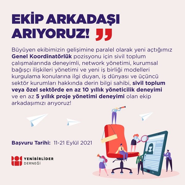 Yenibirlider Derneği Genel Koordinatörlüğü için; sivil toplum çalışmalarında deneyimli, network yönetimi, kurumsal bağışçı ilişkileri yönetimi ve yeni işbirliği modelleri kurgulama konularına ilgi duyan, iş dünyası ve üçüncü sektör kurumları hakkında derin bilgi sahibi, sivil toplum veya özel sektörde en az 10 yıllık yöneticilik deneyimi ve en az 5 yıllık proje yönetimi deneyimi olan yeni ekip arkadaşı arıyor.