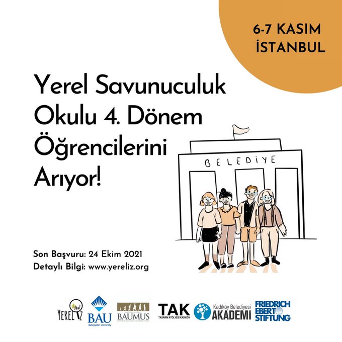 Yerel İzleme, Araştırma ve Uygulamalar Derneği (YERELİZ) ve Bahçeşehir Üniversitesi Göç ve Kent Çalışmaları Merkezi (BAUMUS) iş birliğinde gerçekleşen Yerel Savunuculuk Okulu dördüncü dönemi için öğrencilerini arıyor. Son başvuru tarihi 24 Ekim 2021.