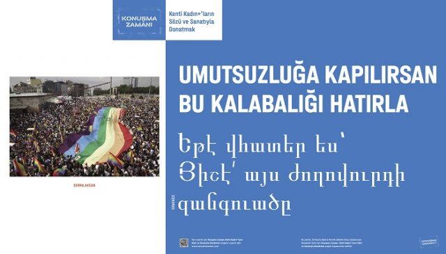 'Konuşma Zamanı: Kenti Kadın+’ların Sözü ve Sanatıyla Donatmak' projesi; eşitlik, adalet, yaşam hakkı, etik yaklaşımlar, özgürlük talepleri içeren ve kazanılmış hakları savunan sloganların kamusal alanda bir kez daha görünür yapıyor.