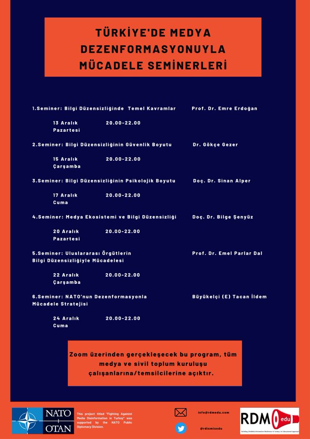 • Büyükelçi (E) Tacan İldem “NATO’nun Dezenformasyonla Mücadele Stratejisi” başlıklarında çevrimiçi seminerler verecekler.