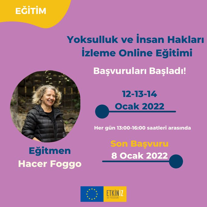 Etkiniz AB Programı 'Yoksulluk ve İnsan Hakları İzleme' online eğitimi düzenliyor. Derin Yoksulluk Ağı'ndan Hacer Foggo'nun vereceği eğitim, 12-13-14 Ocak 2022 tarihlerinde yapılacak. Son başvuru tarihi 8 Ocak 2022.