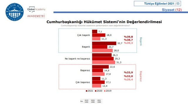 Ülkenin yönetim tarzı olarak katılımcıların %55,7’si Cumhurbaşkanlığı Hükümet Sistemi’ni tercih ederken, %44,3’ü Parlamenter Sistem’i benimsediğini belirmiyor. Bu oranların geçen yıla göre önemli bir değişiklik geçirmediği görülüyor.