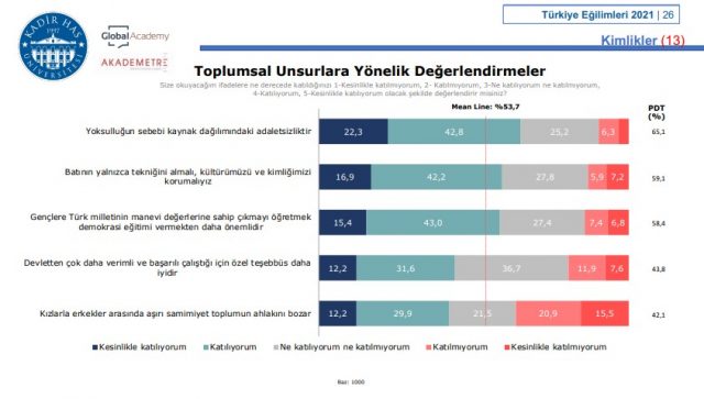 Benzer şekilde, katılımcıların %58,4’ünün “Gençlere Türk milletinin manevi değerlerine sahip çıkmayı öğretmenin demokrasi eğitimi vermekten daha önemli” olduğunu belirttiği görülüyor. Diğer taraftan katılımcıların %50,3’ü (2019’da %35,5) “Türkiye demokratik bir ülkedir” önermesine katıldıklarını belirtiyor.