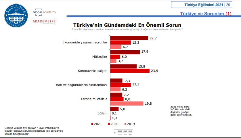 Araştırma sonuçlarına göre Türkiye halkının gündemindeki en önemli mesele yüzde %22,7 ile “ekonomide yaşanan sorunlar” olarak tespit edildi. Sıralamada ikinci sırayı, oranı geçen yılki %6’dan %17,9’a yükselen “mülteciler” alıyor. Geçtiğimiz yıl ilk sırada yer alan “koronavirüs salgını” ise bu yıl %15,8’lik oranıyla üçüncü sıraya gerilemiş gözüküyor. Dördüncü sırada yer alan “hak ve özgürlüklerin sınırlanması” %12,3’ten %7,3’e; beşinci sıradaki “terörle mücadele” ise %8’den %7,2’ye düşmüş. Bu maddeleri %0,1 ile “eğitim” takip ediyor.