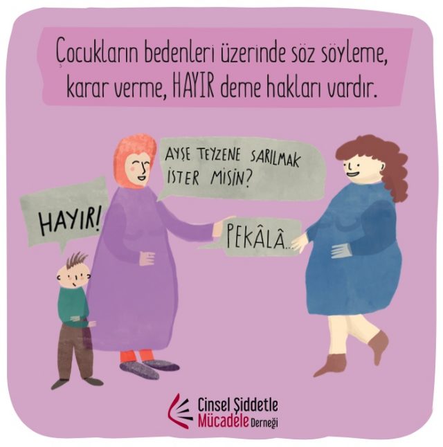 Cinsel Şiddetle Mücadele Derneği, 'Cinsel İstismarı Önlemek Elimizde' isminde çocuğa yönelik cinsel istismarın önlenmesi için bir kitapçık hazırladı. Kitapçığın yetişkinleri odağına almasının temel motivasyonunu Sosyal Hizmet Bilim Uzmanı Ceren Suntekin ve Çocuk ve Gençlik Çalışmaları Uzmanı Nurgül Öz şöyle açıklıyor: “Çocuklar zaten ‘hayır’ demeyi biliyorlar, yetişkinlerden daha sık ve rahatlıkla ‘hayır’ diyorlar. Bu noktada önemli olan yetişkinlerin bu ‘hayır’ları duyması ve dikkate almasıdır. Çünkü Çocuklar ‘hayır’ demenin hali hazırda güç olduğu yetişkinler tarafından istismar ediliyor. Bu nedenle istismarla mücadelede temel sorumluluk yetişkinlere ait.”