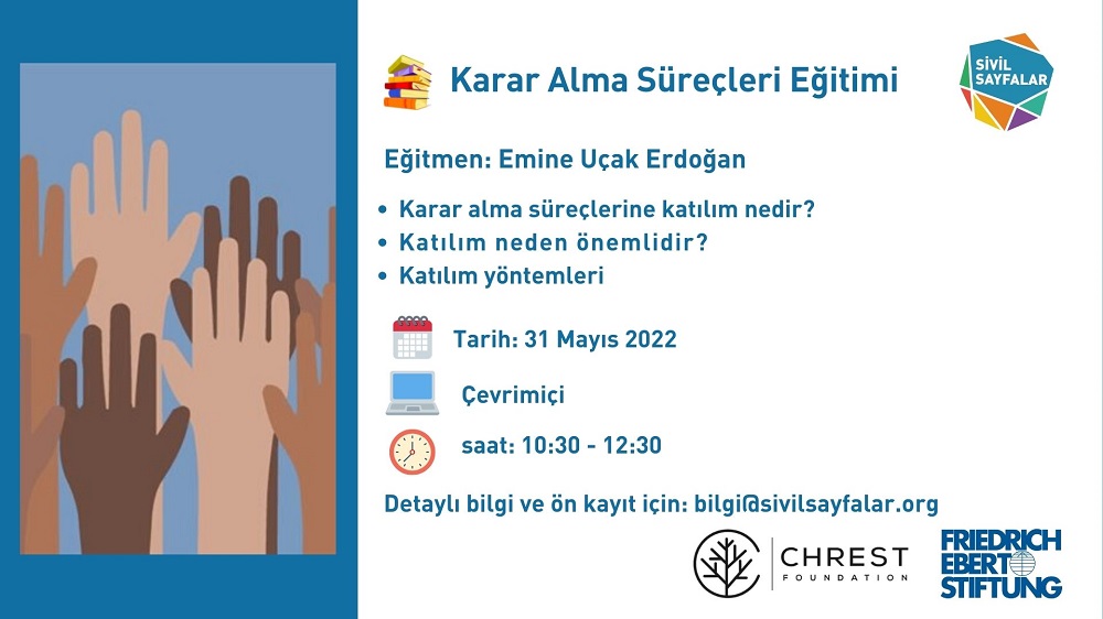 Sivil Toplum ve Medya Çalışmaları Derneği, Chrest Vakfı ve Friedrich Ebert Vakfı desteğiyle yürüttüğü ‘Sivil Toplumun Geleceği’ projesi kapsamında sivil toplum örgütleri ve aktivistler için Karar Alma Süreçleri Eğitimi düzenliyor. Eğitime katılmak için 30 Mayıs 2022 tarihine kadar başvuruda bulunabilirsiniz.