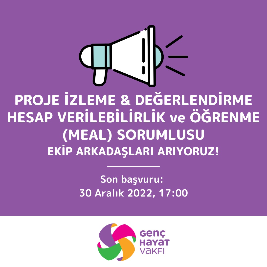 Genç Hayat Vakfı, veri toplama, veri analizi ve veri görselleştirme için uygun MEAL araçlarını geliştirmek ve kullanmak için proje ekiplerine destek verecek İzleme ve Değerlendirme Hesap Verilebilirlik ve Öğrenme (MEAL) Sorumlusunu arıyor.