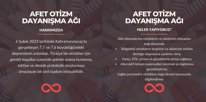 Bu gerekçeyle Afet Otizm Dayanışma Ağını depremzede otistikler ve ihtiyaç duydukları destekleri bir araya getirebilmek amacıyla kurduk. Oluşumumuz gönüllü kişi ve kuruluşlara açıktır.