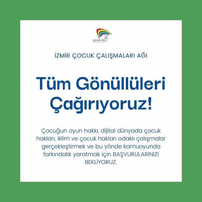 Yerelde çocuk çalışmaları doğrultusunda faaliyet gösteren İzmir Çocuk Çalışmaları Ağı, 2023-2024 yılları içerisinde stratejik planları doğrultusunda çalışmalarında ve ekiplerinde yer almak isteyen gönüllüleri arıyor.