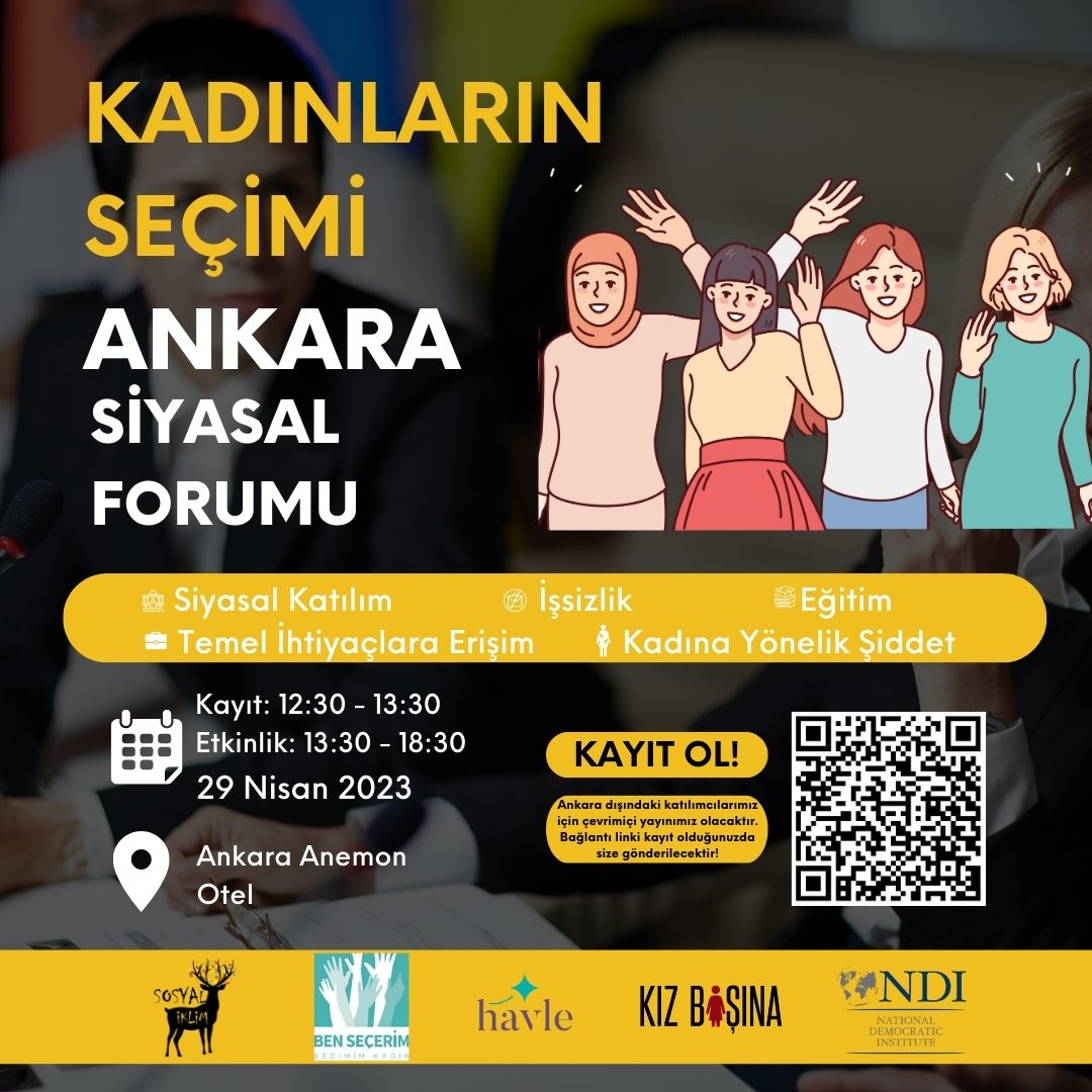NDI Türkiye, Kadınların Seçimi programı kapsamında, Kız Başına Platformu, Sosyal İklim Derneği, Havle Kadın Derneği ve Ben Seçerim Derneği ortaklığında, genel seçimler öncesinde genç kadınların siyasi taleplerini ve önceliklerini siyasi aktörlere duyurmak için Ankara Siyasal Forumu düzenliyor.