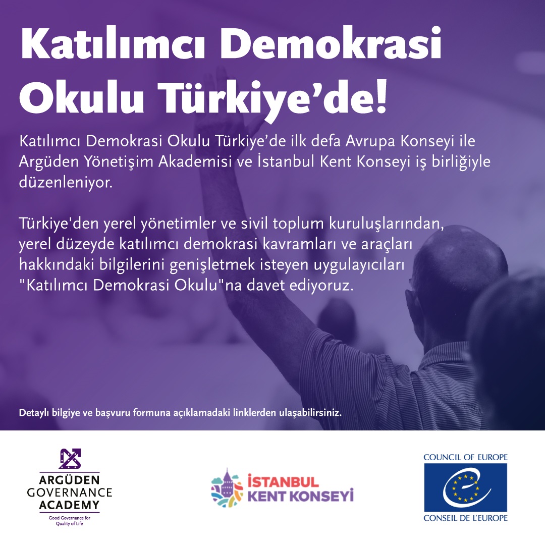 Avrupa Konseyi, Argüden Yönetişim Akademisi ve İstanbul Kent Konseyi iş birliğinde Katılımcı Demokrasi Okulu Türkiye'de ilk kez düzenleniyor. Türkiye'de yerel yönetimler ve sivil toplum kuruluşlarında yer alıp yerel düzeyde katılımcı demokrasi kavramları ve araçları hakkındaki bilgilerini genişletmek isteyen uygulayıcılar, "Katılımcı Demokrasi Okulu"na davet ediliyor.