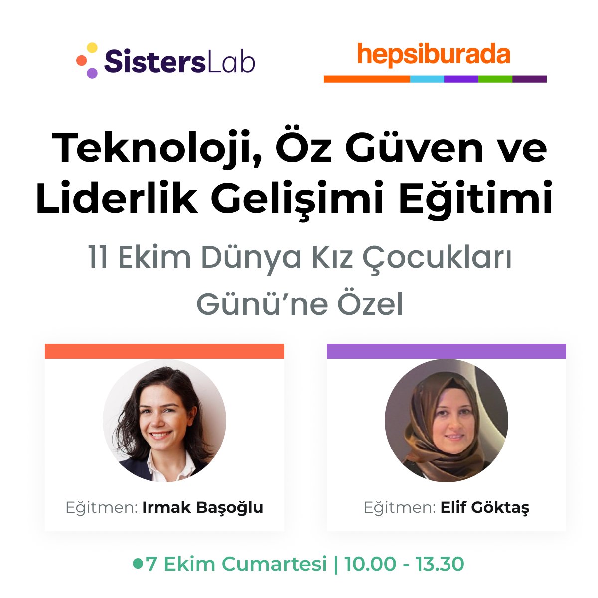 SistersLab, Hepsiburada iş birliğiyle, 11 Ekim Dünya Kız Çocukları Günü'ne özel olarak 'Lise Öğrencisi Kız Çocuklarına Yönelik Teknoloji, Öz güven ve Liderlik Gelişimi Eğitimi' düzenliyor.