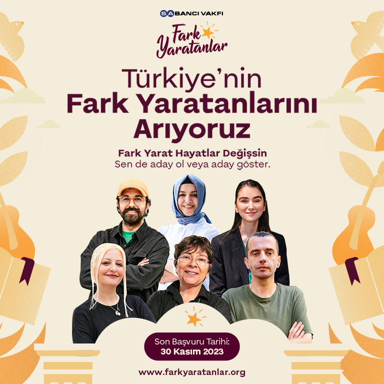 Sabancı Vakfı Fark Yaratanlar Programı, 15. yılında 'Fark Yarat Hayatlar Değişsin!' sloganıyla Türkiye’nin Fark Yaratanlarını arıyor! Çevre, ekonomik gelişme, eğitim, sağlık, toplumsal adalet ve yurttaş katılımı alanlarından başvuru alan programa, 1 - 30 Kasım 2023 tarihleri arasında başvurabilir veya çalışmalarını beğendiğiniz kişi ya da kurumları aday gösterebilirsiniz.