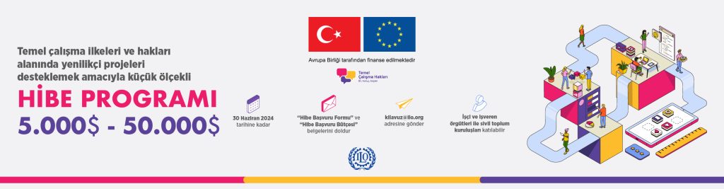 ILO tarafından yürütülen ve Avrupa Birliği Türkiye Delegasyonu tarafından desteklenen “Sosyal Taraflar ve Sivil Toplum Kuruluşlarının Çalışma Yaşamında Temel İlkeler ve Haklar Konusundaki Kapasitelerinin Güçlendirilmesi Projesi” kapsamında, temel çalışma ilkeleri ve hakları alanında projeler için 5.000 ila 50.000 ABD Doları arasında hibe desteği sağlanacak.