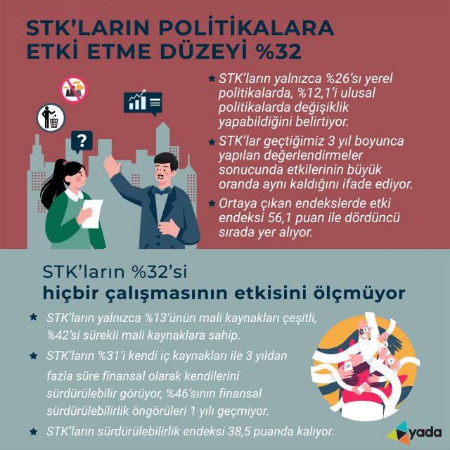 STK'ların yerel yönetimler, kamu kurumları ve diğer yerel ve ulusal otoriteler tarafından hazırlanan politikalara etki düzeyini %32 oranında "etkisiz" olarak değerlendiriyor. Etkili olduğunu söyleyenlerin oranı ise %29 olarak kaydediliyor. Tüm bunlarla birlikte, STK’ların politikalarda değişiklik yaratma gücü de sınırlı kalıyor.