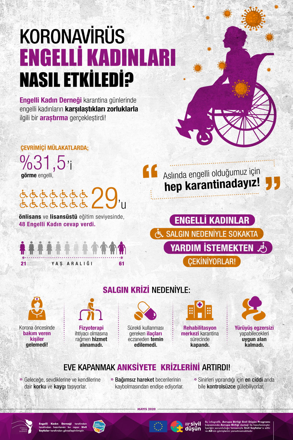 Engelli Kadın Derneği’nin pandemi sürecinde hazırladığı Korona Günlerinde Engelli Olmak raporunu sizler için infografik haline getirdik.