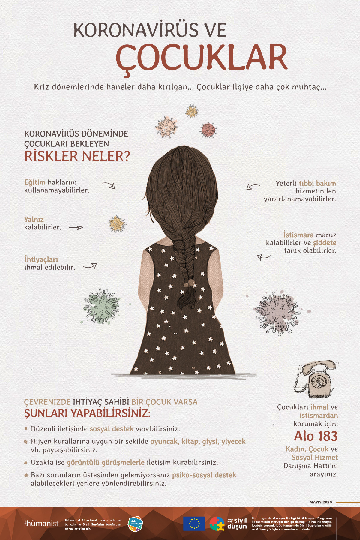 Hümanist Büro’nun hazırladığı Salgınının Çocuklar Üzerindeki Etkileri Bilgi Notu’nu infografik olarak görselleştirdik.  Bilgi notunda salgın döneminde çocukları bekleyen riskler ile ihtiyaç sahibi çocuklar için yapılması gerekenlerle ilgili öneriler yer alıyor.