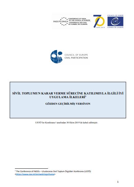 Avrupa Konseyi tarafından düzenlenen Uluslararası Sivil Toplum Örgütleri Konferansı’nda 30 Ekim 2019 tarihinde kabul edilen “Sivil Toplumun Karar Verme Süreçlerine Katılımıyla ilgili İyi Uygulama İlkeleri” STGM’nin Katılım Hakkı projesi kapsamında Türkçeleştirildi.