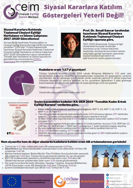 Cinsiyet Eşitliği İzleme Derneği tarafından Kadın Hakları Günü’nde yayımlanan “Siyasal Kararlara Katılım Göstergeleri Yeterli Değil” başlıklı raporda, 2017-2020 döneminde siyasal kararlara eşit katılım olmadığını gösteriyor. Prof. Dr. Serpil Sancar tarafından hazırlanan rapora göre, hem siyasette hem de diğer alanlarda kadınların katılım oranı AB ortalamalarının gerisinde! Türkiye’de %17 olan milletvekili oranı, AB ortalamasında %30.Bakanlıkların üst düzey bürokratları arasında kadın oranı ülkemizde %8 iken AB ortalaması %42.