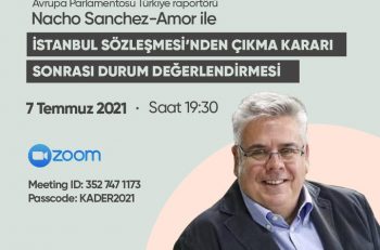 Kadın Adayları Destekleme Derneği (KA.DER), Avrupa Parlamentosu Türkiye raportörü Nacho Sanchez-Amor'in konuk olacağı Türkiye'nin İstanbul Sözleşmesi'nden Çıkma Kararı Sonrası Durum Değerlendirmesi başlıklı bir söyleşi düzenliyor. Söyleşi 7 Temmuz 2021 Çarşamba saat 19.30'da Zoom'da yapılacak.