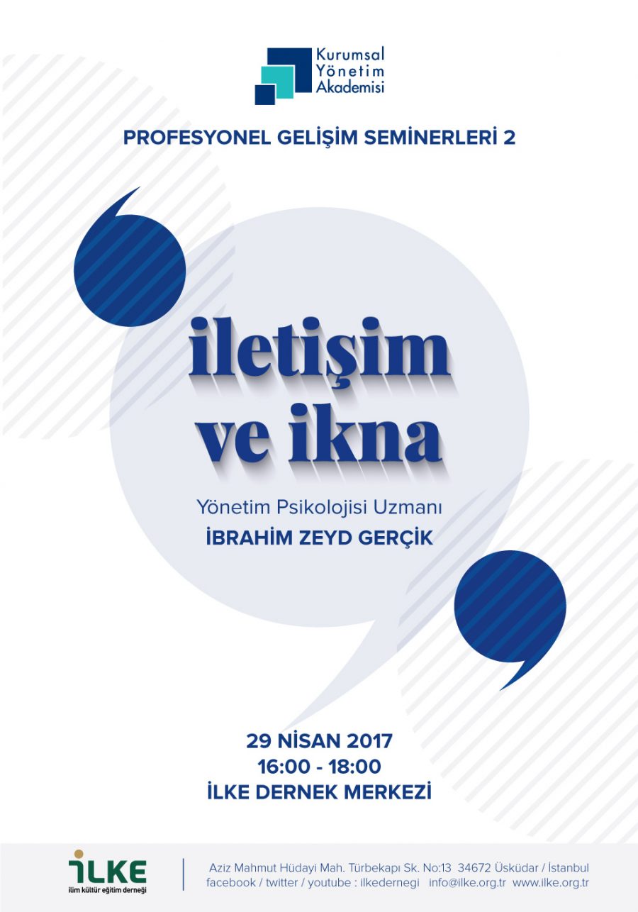 İLKE Derneği Kurumsal Yönetim Akademi’sinin 2017 yılı faaliyetleri “Profesyonel Gelişim Seminerleri” dizisinin ikinci eğitimi, yönetim psikolojisi uzmanı İbrahim Zeyd Gerçik’in “İletişim ve İkna”eğitimi ile devam ediyor. 29 Nisan 2017 Cumartesi tarihinde İLKE Derneği’nde 16.00-18.00 saatleri arasında gerçekleştirilecek etkinliğe katılım ücretsiz olacak. Eğitim STK’larda profesyonel ve gönüllü çalışanlara açıktır. İletişim ve İkna başlıklı eğitimde İbrahim Zeyd […]