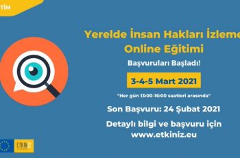 Etkiniz AB Programı, sivil toplum örgütlerini “Yerelde İnsan Hakları İzleme” online eğitimine katılmaya davet ediyor. 3-4-5 Mart 2021 tarihlerinde düzenlenecek olan eğitime son başvuru tarihi 24 Şubat 2021.
