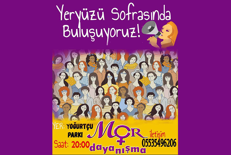 Mor Dayanışma, kadın dayanışmasını yükseltmek için İstanbul Kadıköy’de yeryüzü sofrası kuruyor. Mor Dayanışma, 28 Mayıs’ta Kadıköy Yoğurtçu Parkı’nda ‘yeryüzü sofrası’nda buluşuyor. Kadın dayanışmasını yükseltmek için bir araya gelecek olan kadınlar birlikte akşam yemeği yeyip, bolca sohbet edecek. Kadın atölyelerinin de yapılacağı yeryüzü sofrası, 28 Mayıs Pazar 20.00’da Kadıköy Yoğurtçu Parkında kurulacak. Kaynak